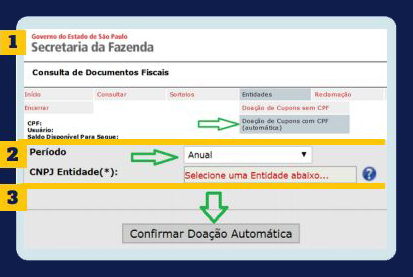 clique na opção Entidades e na opção Doação de Cupons com CPF (automática).